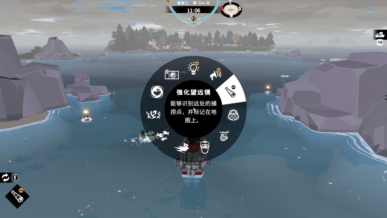 使用望遠鏡發現每種可捕撈的魚。抓魚之前看一下就行,只用看捕魚點的魚就行,蟹籠和漁網專屬不用看。