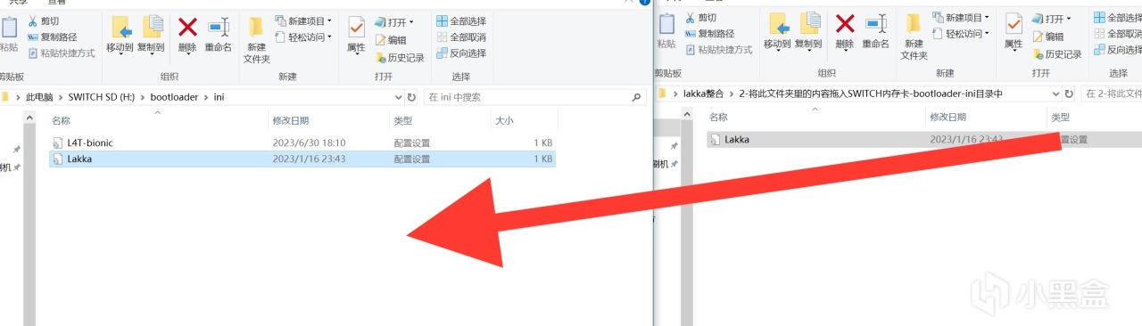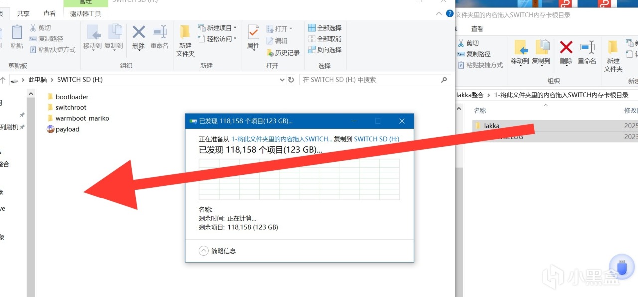 接下来,将系统包的文件夹“2-将此文件夹里的内容拖入SWITCH内存卡-bootloader-ini目录中”就像下图这样