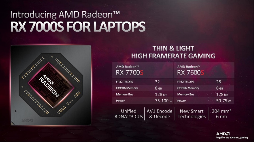 笔记本配备了Radeon RX 7700S移动显卡,采用最新的RDNA 3架构,32组CU,共计2048个流处理器,拥有8GB GDDR6 18Gbps显存,32MB第二代Infinity Cache,显存位宽为128bit,功耗范围75-100W。