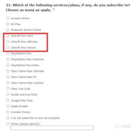 近日GOG平台发布的一项新调查可能暗示育碧计划在不久的将来扩展育碧Plus服务,并设置多个服务付费等级。在调查玩家们都订阅了哪些平台所推出的订阅服务这一问题时,育碧平台方面有着:Ubisoft Plus Gold、Ubisoft Plus Ultimate以及Ubisoft Plus Deluxe这三个答案。