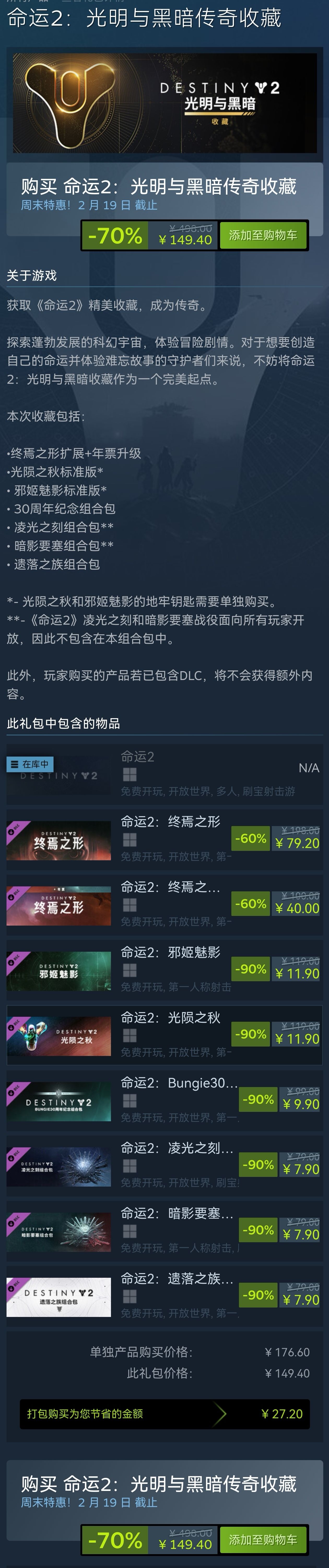 大家好,就在今晚凌晨的时候,《命运2》给旗下的DLC开启了促销活动,折扣力度为史低,游戏本身是免费的,但是旗下DLC都是付费的,游戏为美国游戏公司Bungie(又名棒鸡)开发制作而成。