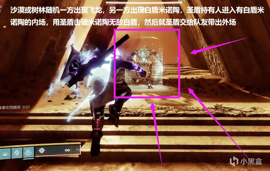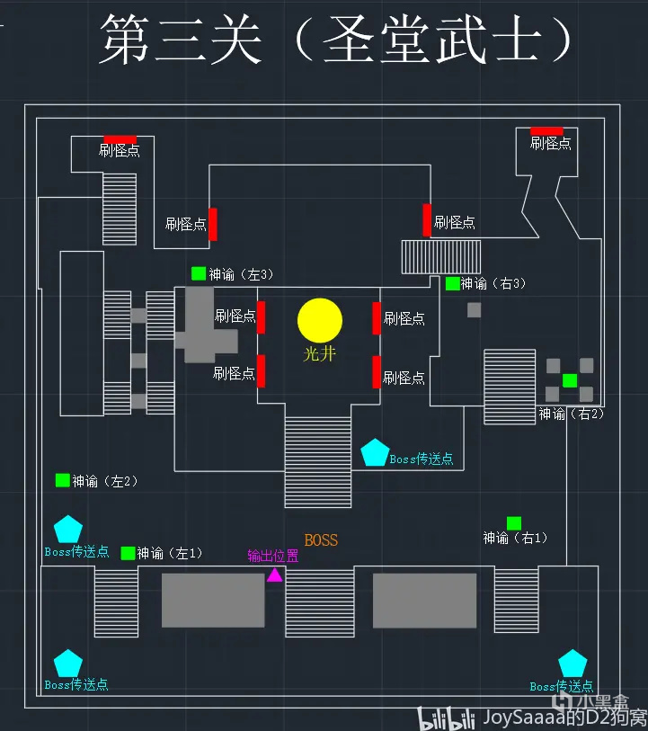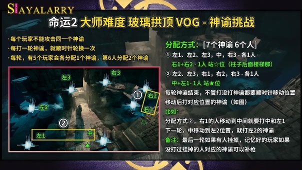 关卡流程:同神谕关一样按顺序击破神谕(本关只会出现3个神谕且中间不会出神谕,因此仅需留意左右两边的6个点位),1人拾取圣盾,2人负责观察神谕并击破三个神谕,等待拾取了圣盾的玩家击破BOSS护盾后即可开始输出
