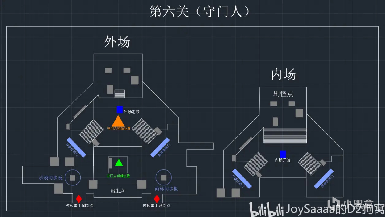 外场守台清怪2人:左右圆圈占领区站点,优先击杀守门人和过载勇士