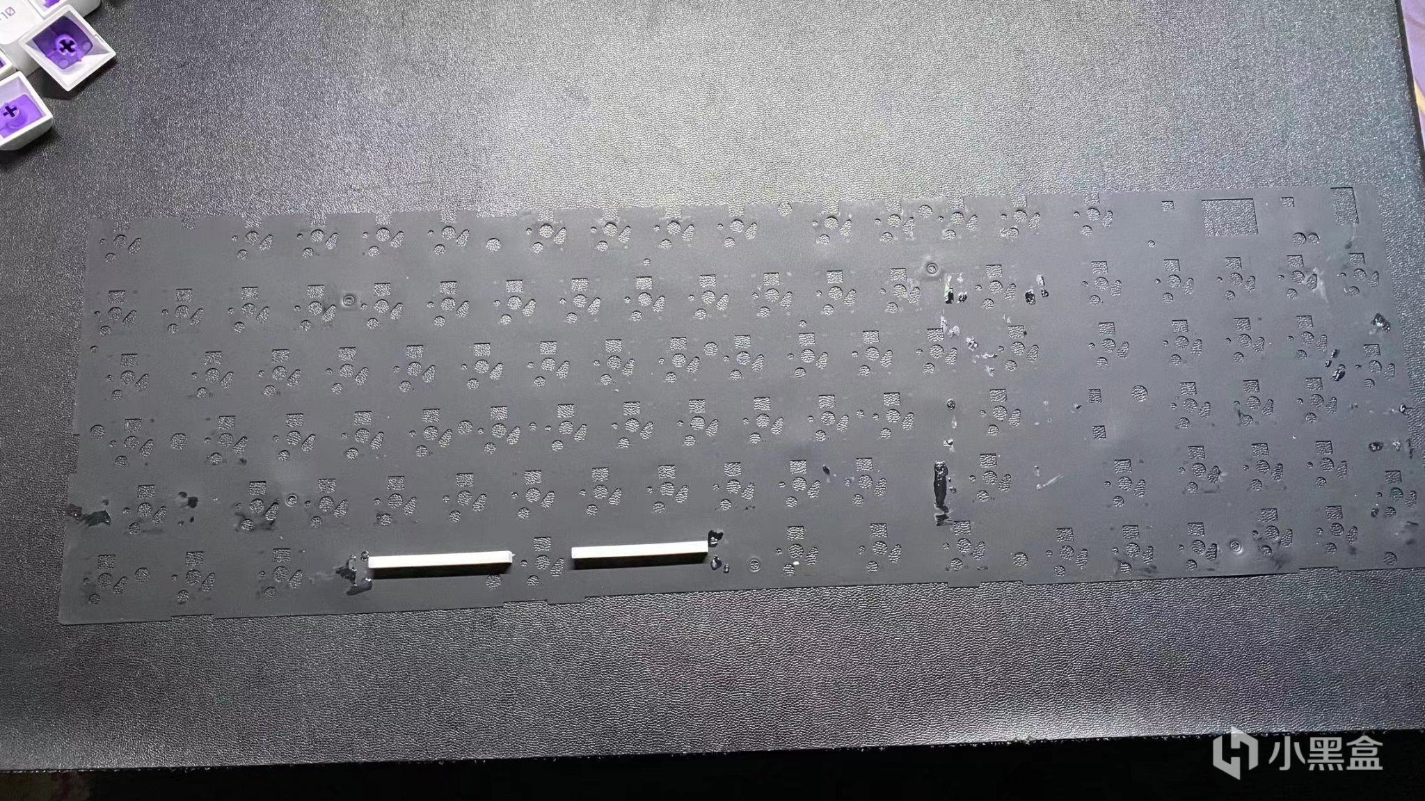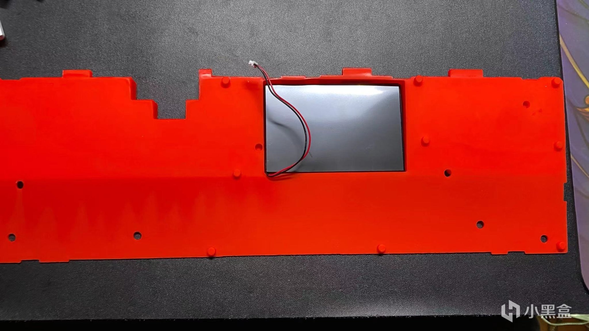 底棉这里其实也是直接把电池贴在底棉上面了,底部硅胶开模开始非常厚实的,减小了底部的空隙,是的键盘的空腔音进一步的减小。