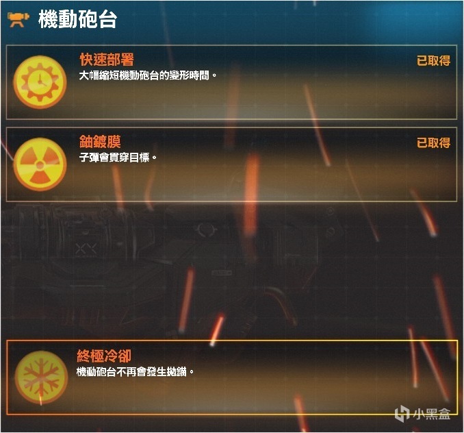 快速部署;大幅加快機動炮臺變形,默認變形有點慢,建議儘快點了。