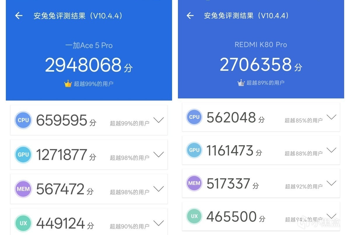 两台手机分别用安兔兔V10.4.4进行跑分,一加Ace 5 Pro比红米K80 Pro要高24万分,主要原因就是一加内存规格更高,加上一加自研的内存基因重组3.0与焕新存储技术可以确保手机4年不卡顿,大大节约了换机成本。红米K80 Pro虽然在CPU、GPU、MEM三项落后,但在UX项得分更高。
