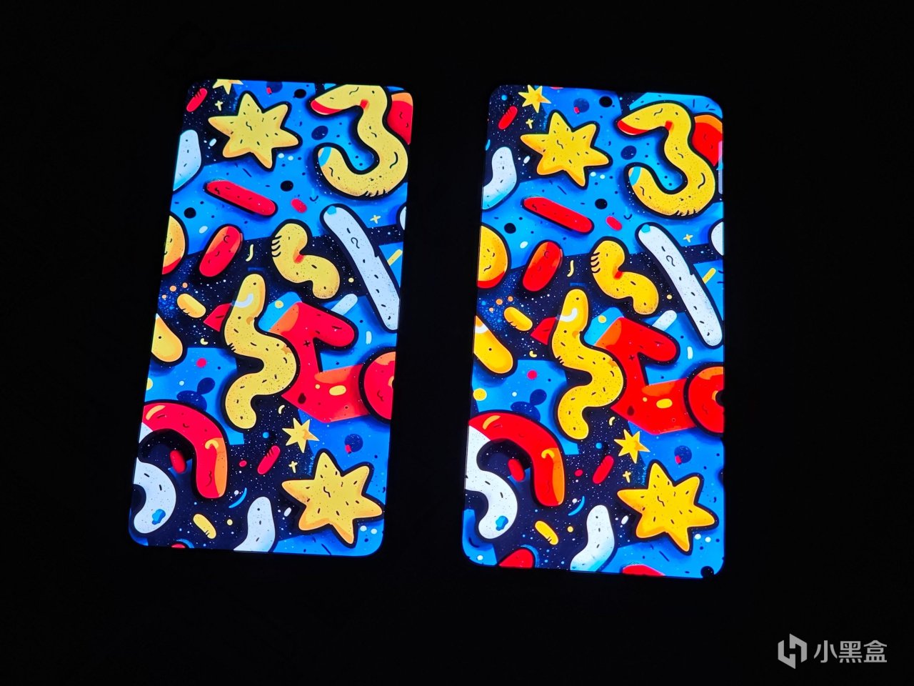 关闭所有灯光在无光环境下,两款屏幕显示效果相当接近。如果换一下两款手机的位置,你能猜出它们分别是哪一款吗?