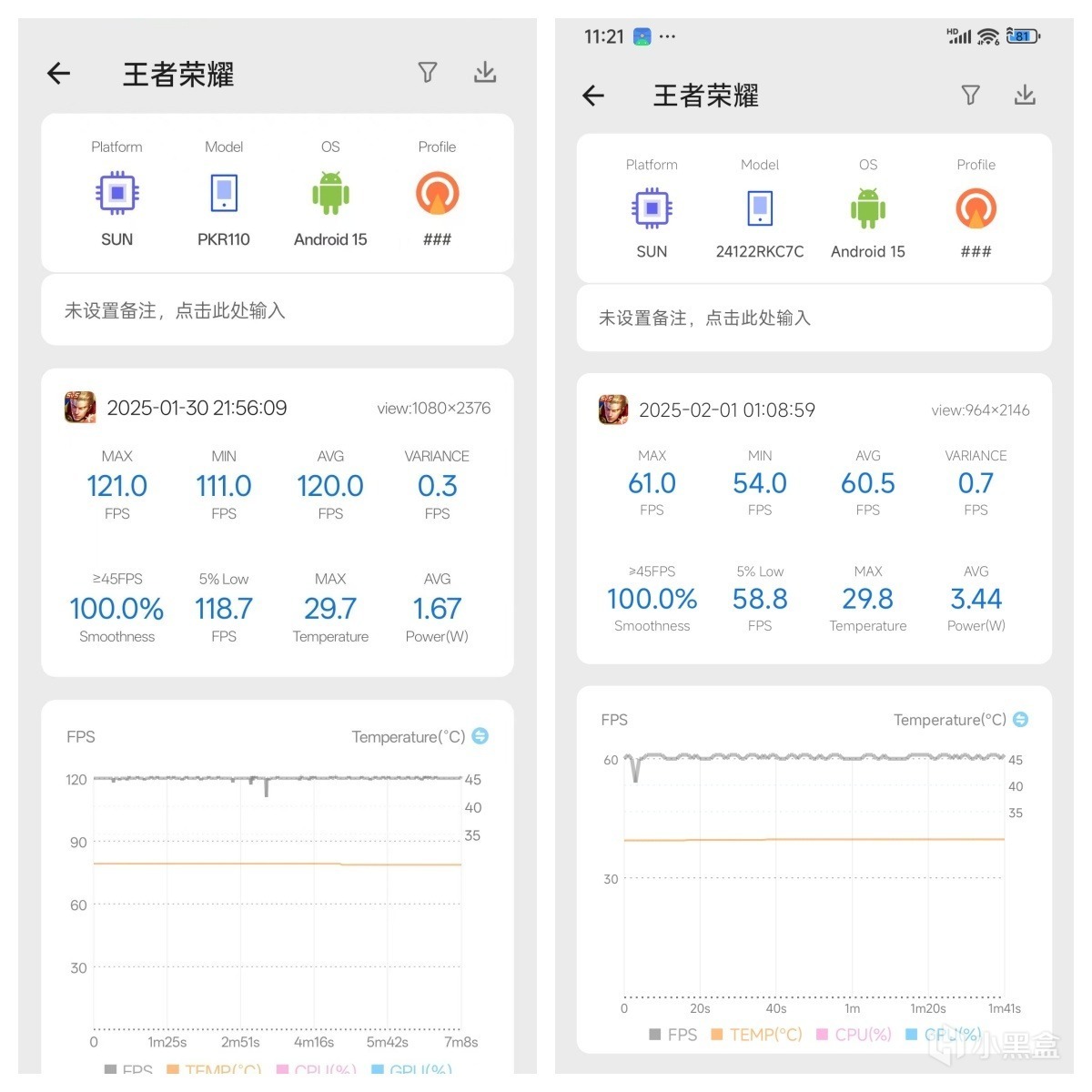 风驰游戏内核可以让一加Ace 5 Pro实现原生级120帧的游戏画面,玩《王者荣耀》时整个画面相当清晰流畅,哪怕团战也没有丝毫延迟或卡顿,使用软件可以记录游戏的帧率、温度以及功耗。红米K80 Pro使用外挂独立芯片插帧实现120帧,画面流畅度相对差一点,而且无法通过软件获得实际帧率,功耗也要高一点。如下图所示:左侧一加帧率一直比较稳定,5%low帧仅118.7,右侧红米没办法测得120,只能测得60帧。