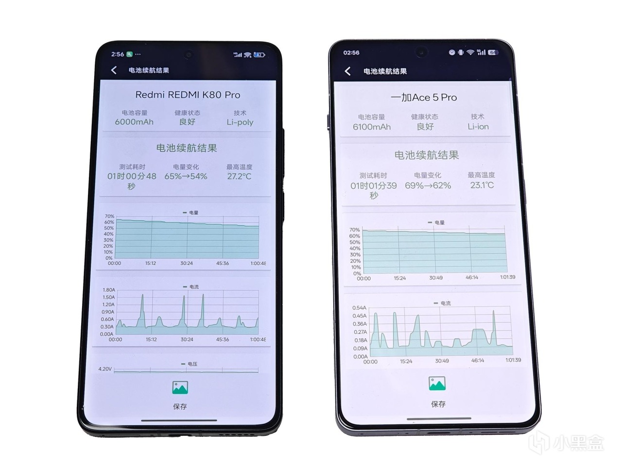 电池方面一加Ace 5 Pro搭载全新一代6100mAh硅负极冰川电池,即使在-20度的东北室外也能保证续航。红米K80 Pro搭载小米首个120W 6000mAh金沙江硅碳电池。我们使用电池狗狗进行续航一小时测试,一加Ace 5 Pro电量由69%下降到62%,红米K80 Pro由65%下降到54%,续航方面一加Ace 5 Pro更棒。另外,测试过程中一加最高温度仅23.1度,比红米的27.2度更低。