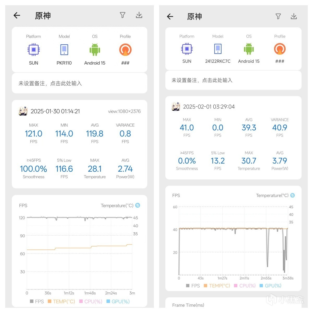 接着我们试试《原神》,一加作为原神的战略合作伙伴,一加Ace 5 Pro可以120帧稳定畅玩,清晰出众的游戏画面让人赏心悦目,即使角色在高速奔跑中也感觉不到残影或拖影,通过软件测得两款手机的帧率如下图所示,一加Ace 5 Pro帧率表现比较平稳,红米K80 Pro帧率有较大的波动,温度、功耗也略高。