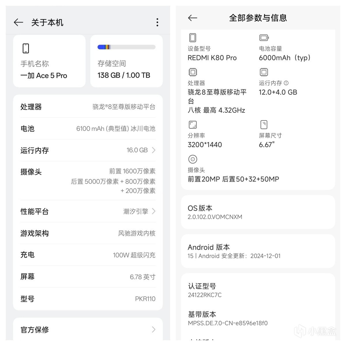 小结:两款手机在游戏方面的表现都非常不错,画面清晰流畅、触控灵敏、温控优秀,长时间玩游戏也不会烫手、累眼。一加Ace 5 Pro在画面、温控、功耗方面相对而言更加出色,另外一加与多款流行游戏通过战略合作进行深度优化,带来更优秀的游戏体验,这一点也是红米K80 Pro所没有的。