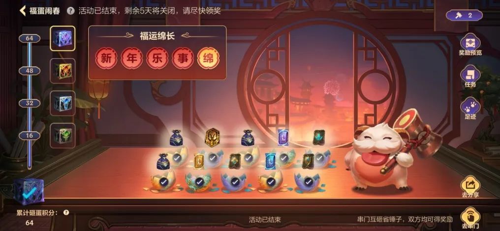 福蛋闹春活动已结束,活动入口剩余5天关闭。截止至2月11日23:59,召唤师可根据砸蛋积分领取相对应的皮肤宝箱,最高可获得史诗皮肤~