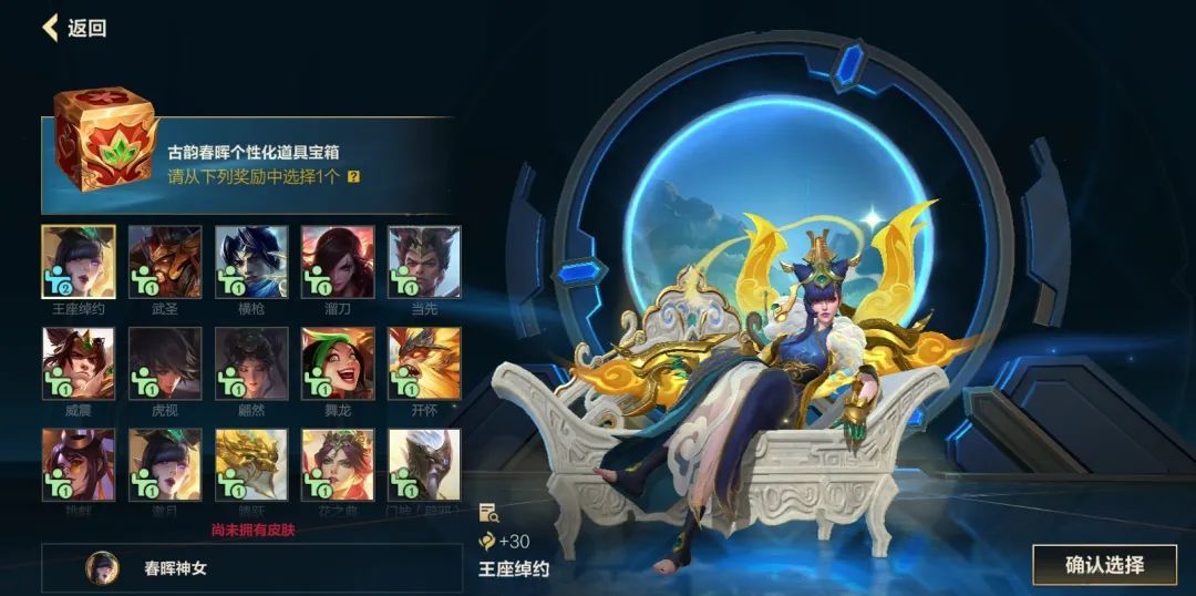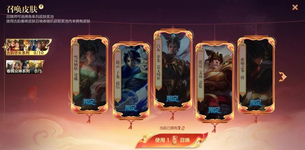 在召唤皮肤界面消耗古韵春晖皮肤召唤券,可选择任一奖池随机获取奖池内未拥有皮肤。