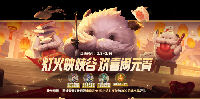 元宵佳节欢聚峡谷!2月8日(明日)0:00-2月16日23:59,召唤师累计登录7天可领奥瑞利安·索尔炫彩皮肤与龙魂水晶*300好礼!