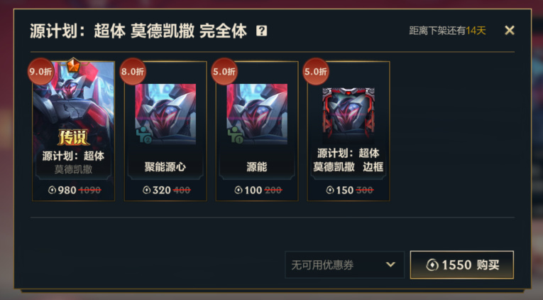 即日起至2月20日23:59,召唤师可以1550点券的优惠价格购入源计划:超体 莫德凯撒 完全体礼包,礼包内包含9折优惠的传说皮肤-源计划:超体 莫德凯撒和8折优惠精英姿态-聚能源心,更有5折优惠的姿态-源能、皮肤边框-源计划:超体 莫德凯撒。