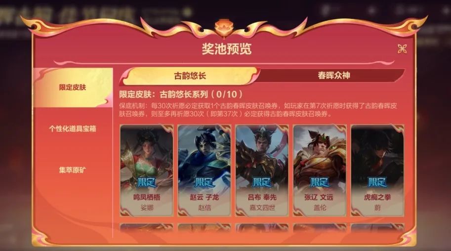 保底机制:以古韵春晖皮肤召唤券为例,每30次祈愿必定获取1个古韵春晖皮肤召唤券,如召唤师在第7次祈愿时获得了古韵春晖皮肤召唤券,则至多再祈愿30次(即第37次)必定获得古韵春晖皮肤召唤券,各类型奖励保底次数可前往奖池预览界面查看。