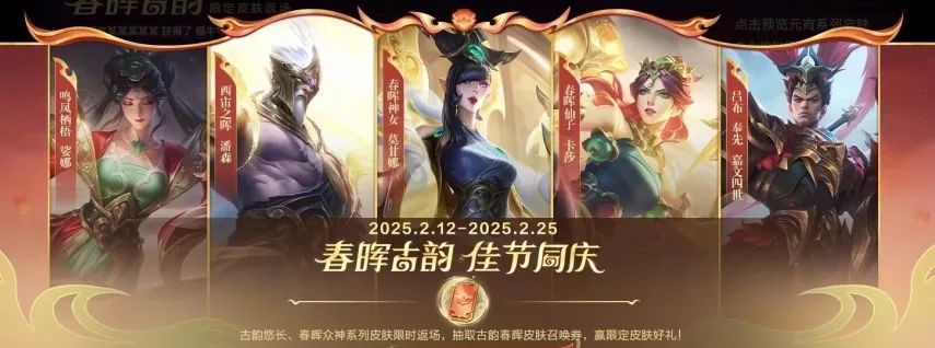 2月12日11:00(各大区陆续开启)-2月25日活动期间,【古韵悠长】、【春晖众神】系列皮肤限时返场,抽取古韵春晖皮肤召唤券,赢限定皮肤好礼!