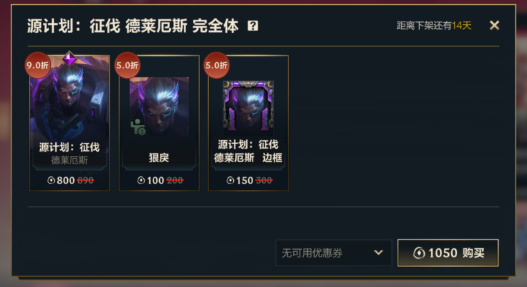 除此之外,即日起至2月20日23:59,召唤师只需以1050点券的优惠价格即可分别购入源计划:征伐 德莱厄斯完全体礼包和源计划:匿影 图奇完全体礼包,礼包内包含9折优惠的各英雄皮肤,更有5折优惠的各皮肤对应姿态和皮肤边框。