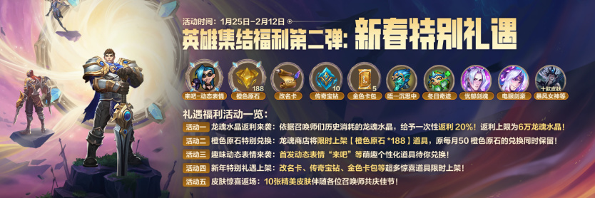 英雄集结福利第二弹-新春特别礼遇高能来袭,截止至2月12日,召唤师参与活动即可领海量福利好礼~