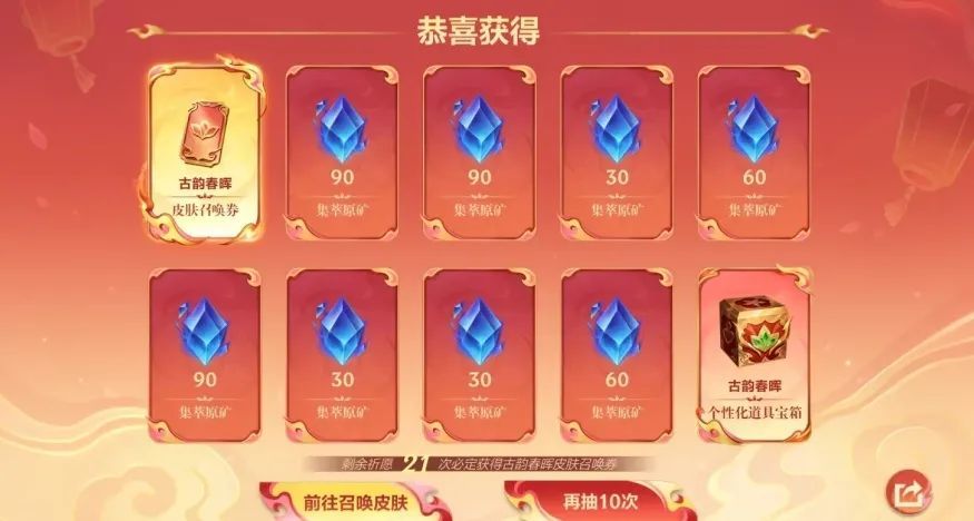 每10次祈愿必定获取1个古韵春晖个性化道具宝箱,可前往游戏内背包开启宝箱。召唤师还可选择“加购”购买宝箱,上限10个。
