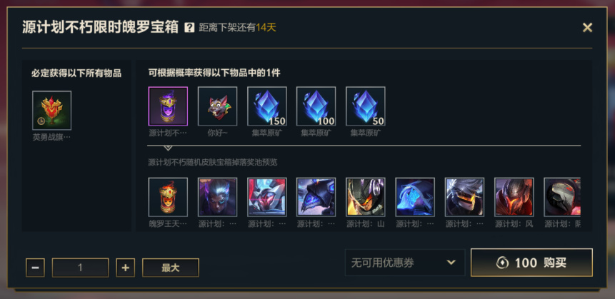 除此之外,源计划不朽限时魄罗宝箱也在同步热卖中!即日起至2月20日23:59,召唤师使用100点券开启宝箱,即可获得英勇战旗-金牛战旗(1天),还有机会获得源计划不朽随机皮肤宝箱、局内表情-你好~和集萃原矿好礼~