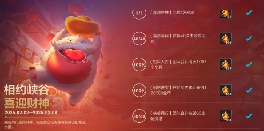 峡谷同行,喜迎财神!截止至2月8日(明日),召唤师完成活动任务即可领取龙魂水晶*888好礼~
