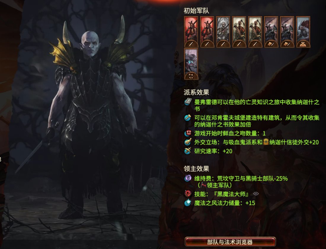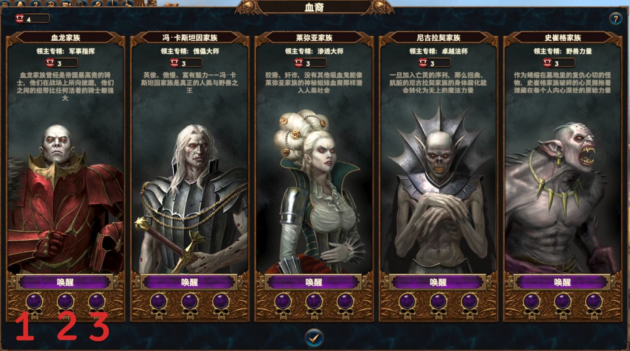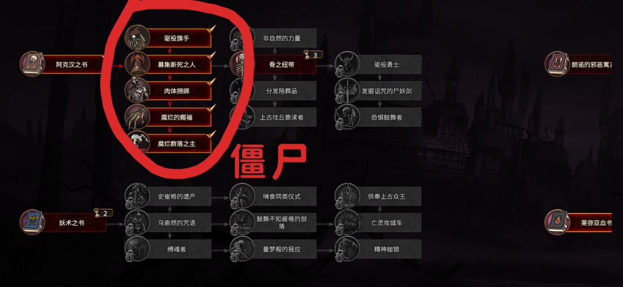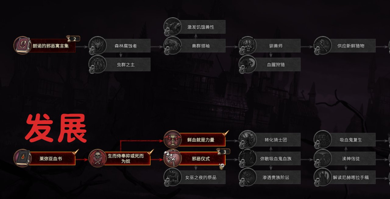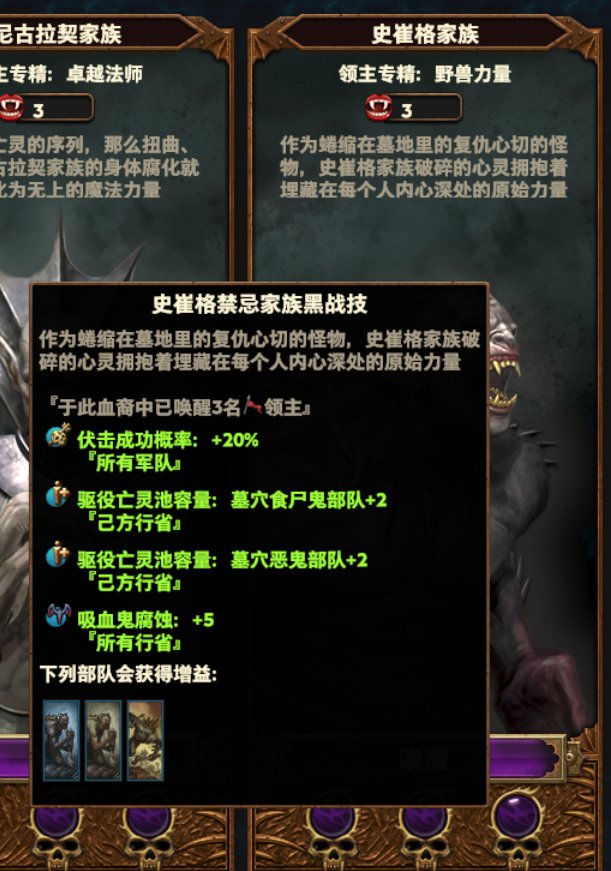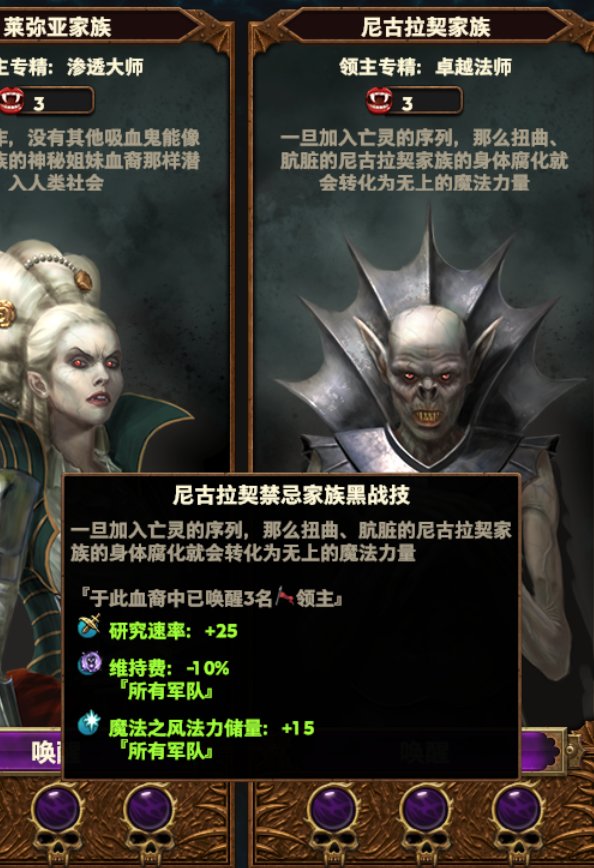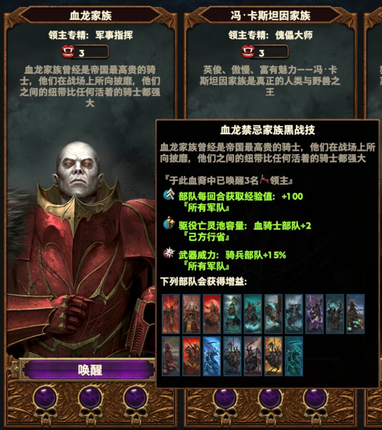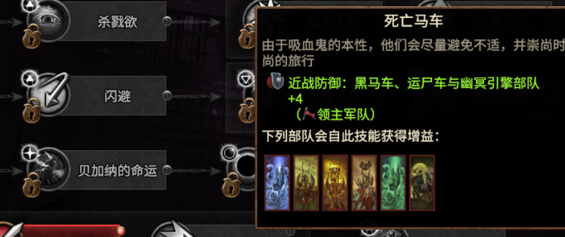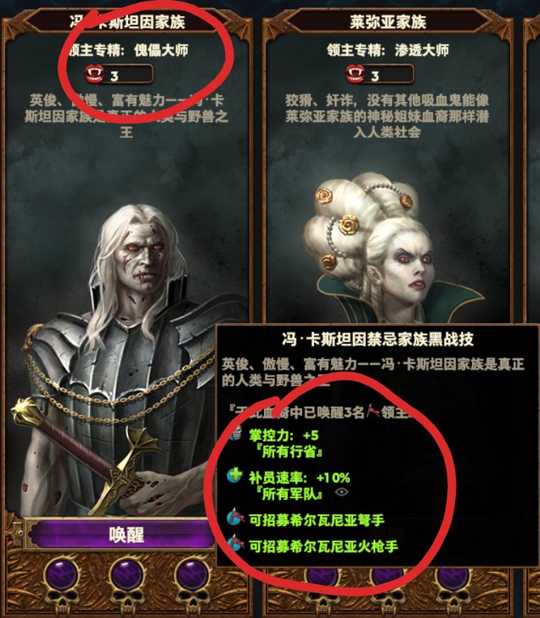 前期我会主点「卡斯坦因」本家的增益,其一是吸血鬼掌控力上升比较慢;其二提升补员速率。不过炮灰部队打完直接合并就行了,补不补无所谓。主要是给后面的比如地鬼、血骑士、尸车部队补员,不是每一场仗都能打出大伤亡的尸坑。