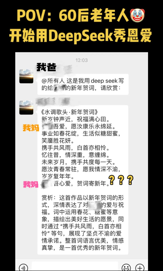 聊天記錄往上面一翻,還有老爸用 DeepSeek 即興代寫的一篇深情告白詩。。。連路邊攤烤串的老闆,都能就着大醬來上幾句 DeekSeek 的使用心得。