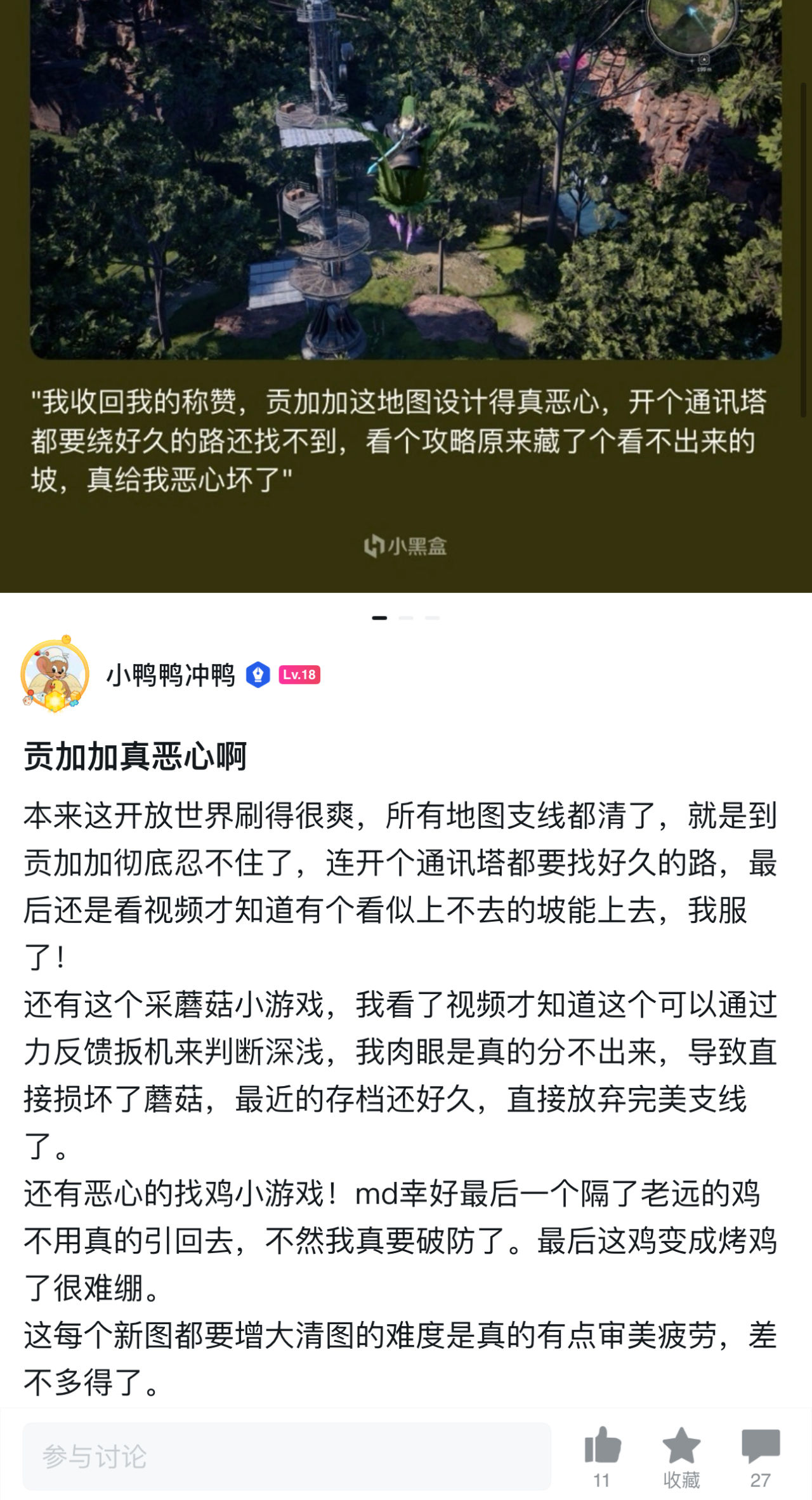 虽说一开始做收集刷得很爽,但是到了贡加加这个森林地区之后我直接破防了。连开个通讯塔都要找好久的路,最后还是看了攻略视频才知道有个看似上不去的坡能上去。贡加加这个地图就恶心在很多地方明明近在咫尺但你根本不知道怎么过去,找了好几次攻略。后面的星陨峡谷用高低差也制造了几个恶心的点位,好在并没有贡加加这么让人心烦,而此外的区域基本上都比较友好。如果你厌恶清单式开放世界,那么每个地图只做一下古代遗物的四个任务了解剧情就好。另外必须要说的是,很多支线需要你刷足够兴趣点才能制作关键道具,因此探索是不可避免的。