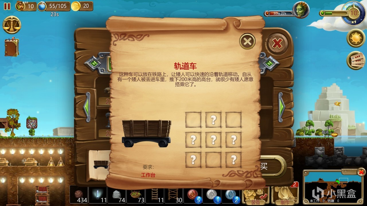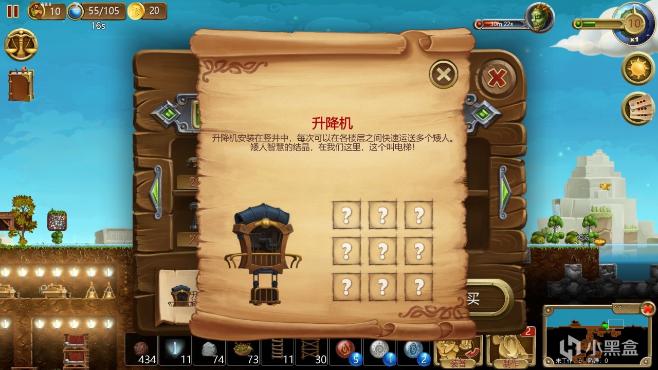 ③当矮人从矿山运送资源到仓库时,使用机械装置可以加快矮人的速度:升降机用于垂直移动,矿车用于水平移动。