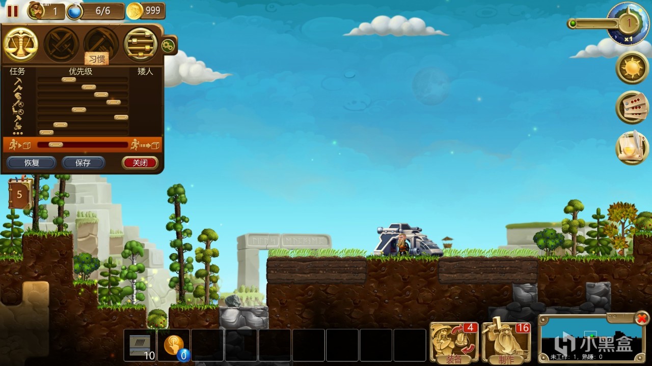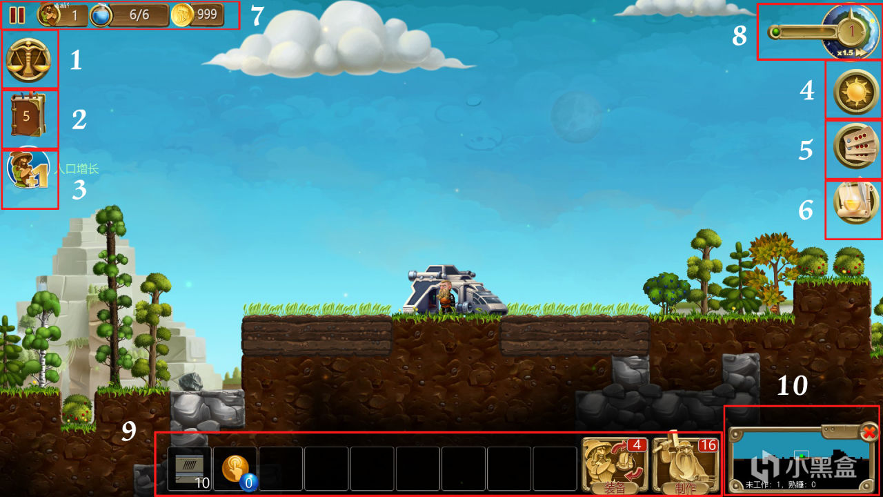 从左到右分别为,游戏暂停(退出、重开、游戏画面声音设置)、矮人数量(总人口/闲置人口)、魔法值、金币数量