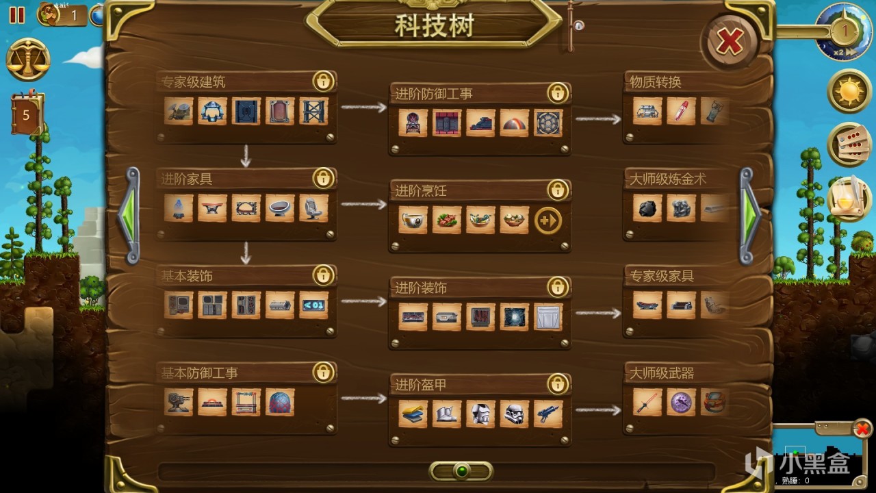 在沙盒模式中没有科技树,但是关卡战役中,很多物品是通过科技树一层层解锁的。