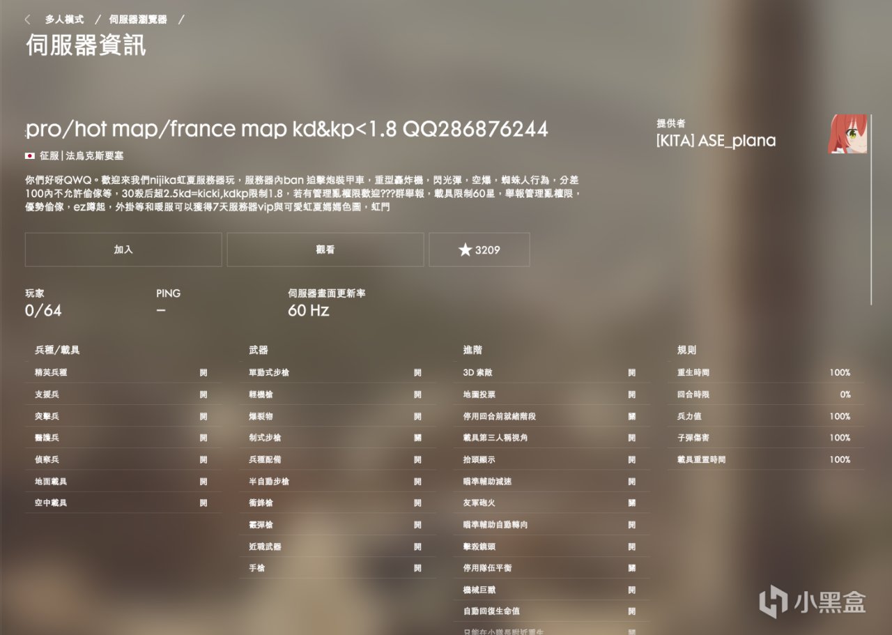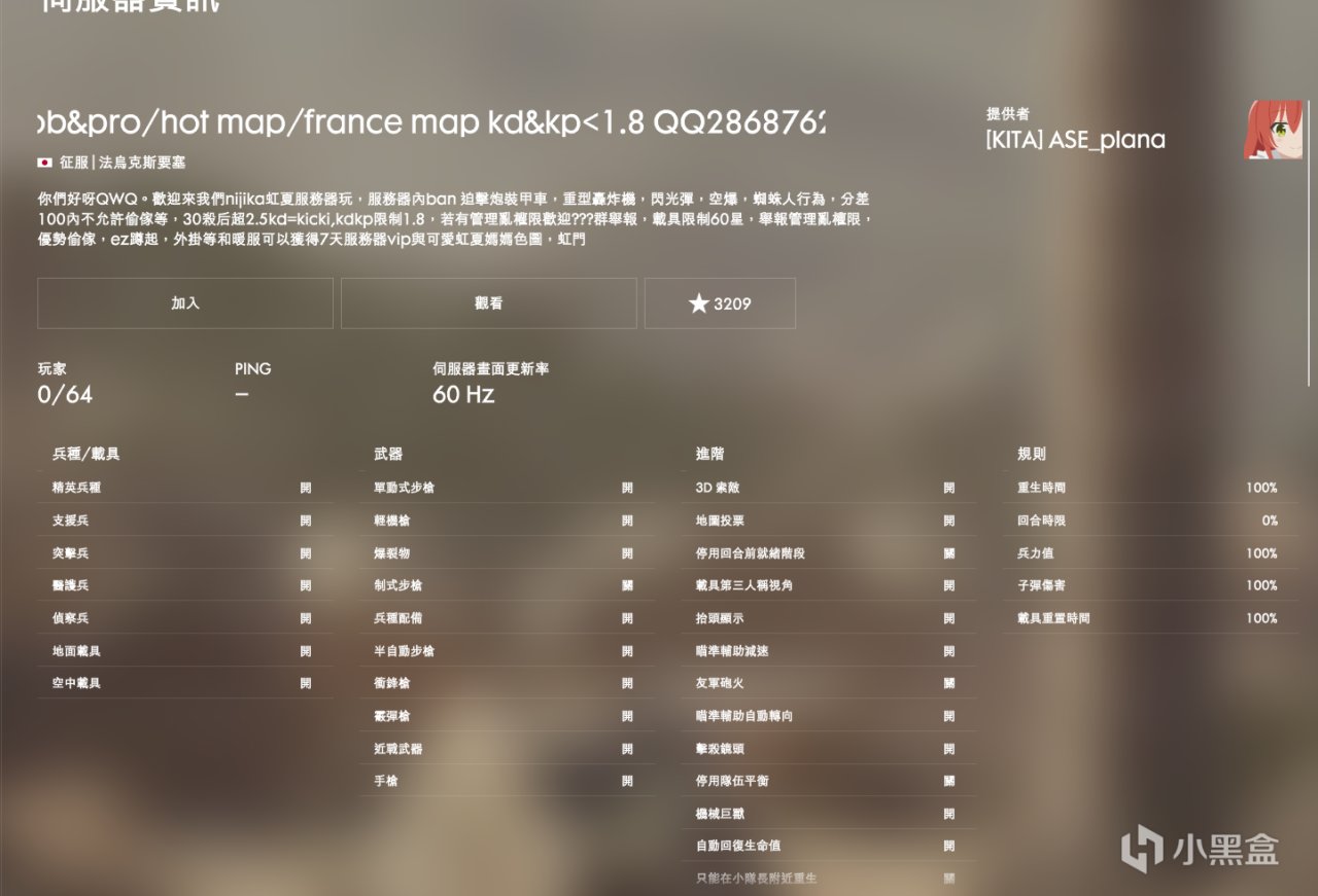 這個界面能看到服務器的簡介,一般的服務器都會在這裏寫服規,如果你想玩一些容易被t的武器但是你不確定這個服能不能玩,可以點進來看清楚了再進去玩,當然,你還可以從這個界面點進去觀戰服務器。,當然也可以在外面點擊三角形旁邊的三個點哪裏選擇觀看,不用點進這個界面觀戰。