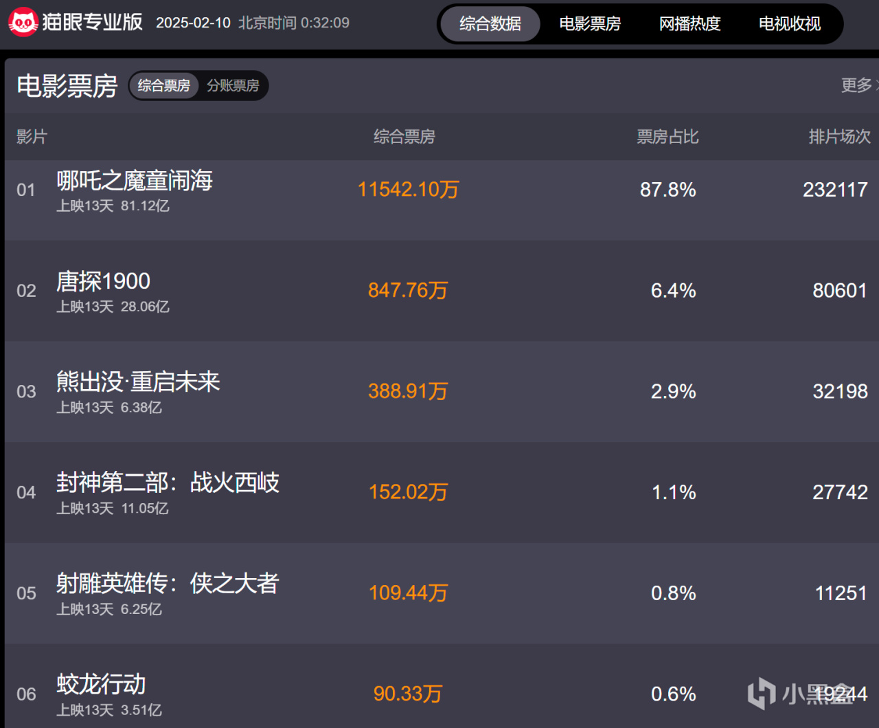 今年的春節檔(1.28-2.4)總票房達95.10億元,觀影總人次1.87億,刷新了中國影史記錄。其中《哪吒2》的票房更是連連破紀錄,現在正朝着100億衝刺着。
