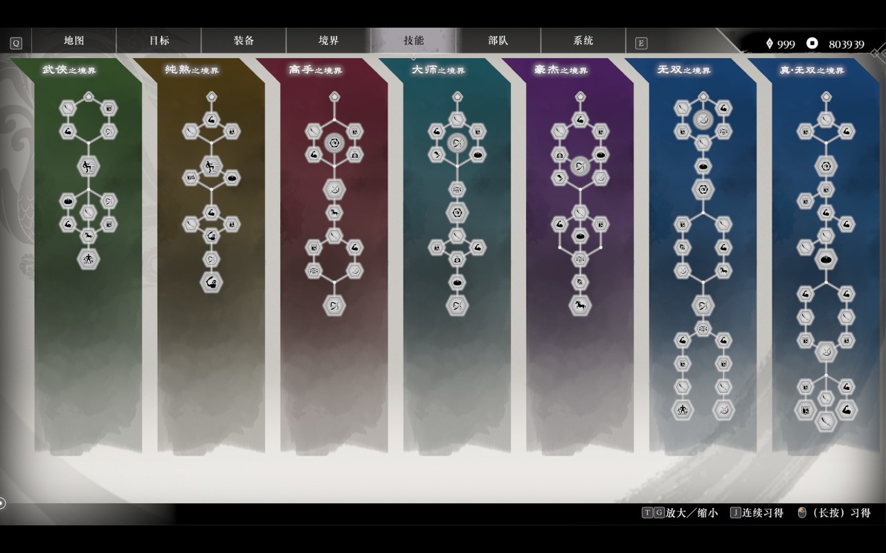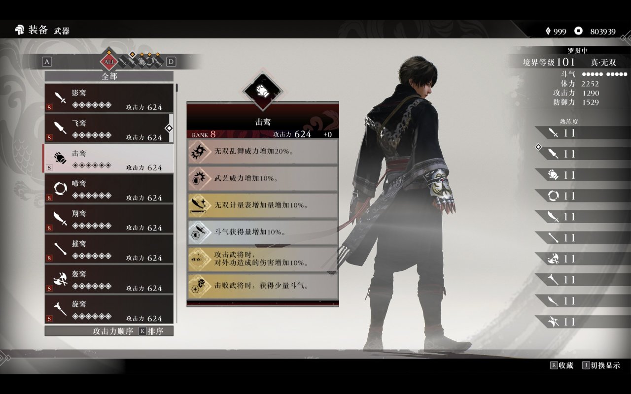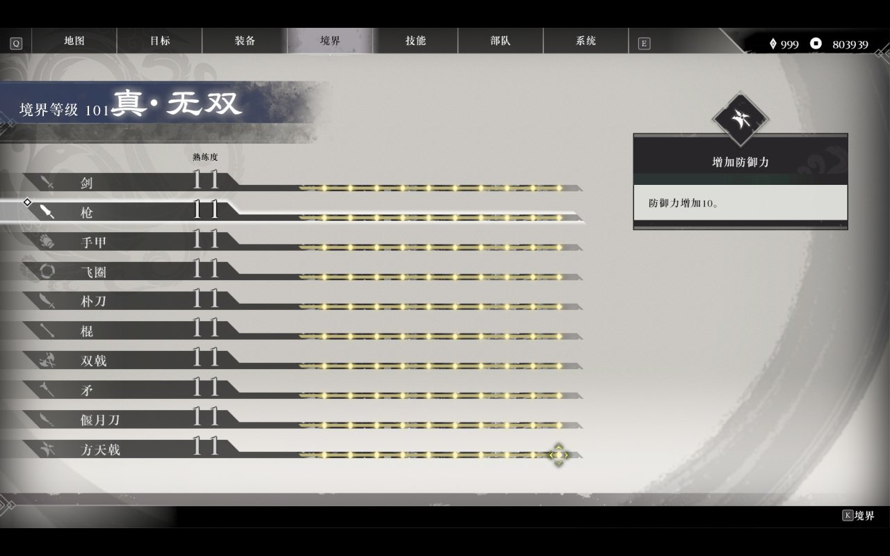 本作主角的等级是和武器熟练度相挂钩的,武器熟练度也关系到新天赋树的解锁,也就是说你必须每把武器都需要练一练,刷一刷,我个人还是比较喜欢这种设计的。此外升级武器熟练度还能解锁一些武艺以及追加操作等等,比如朴刀要玩到7级才能解锁完整形态——满蓄铁山靠,偃月刀毕业武艺大山刚破掌要玩到8级。武将情谊事件也会给一些挑战和奖励,挑战又和战斗挂钩。所以能看出来制作组就是想让你一直战斗爽,不过刷久了还是有点累的