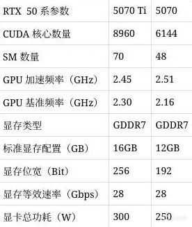 5070Ti配備 8960 個 CUDA 核心,16GB GDDR7顯存(256 bit位寬),TDP爲 300W,性能猜測可能會與RTX 4080s相當,因爲RTX 5080僅比後者快 10-15%。
