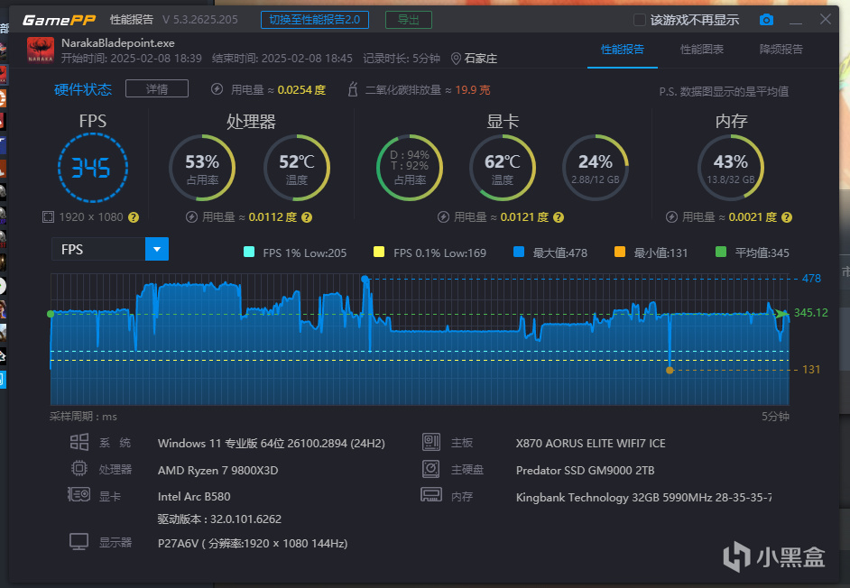 《永劫無間》在1080P的模式下,幀率達到了345,1%的Low幀爲205。