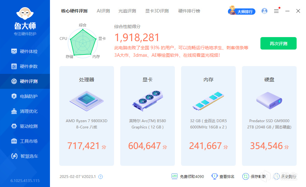 再次使用魯大師進行跑分,這個時候我們可以看到內存的分數較默頻提升19%,達到了287587分。在內存的加持下,整機的分數達到了1941527分。