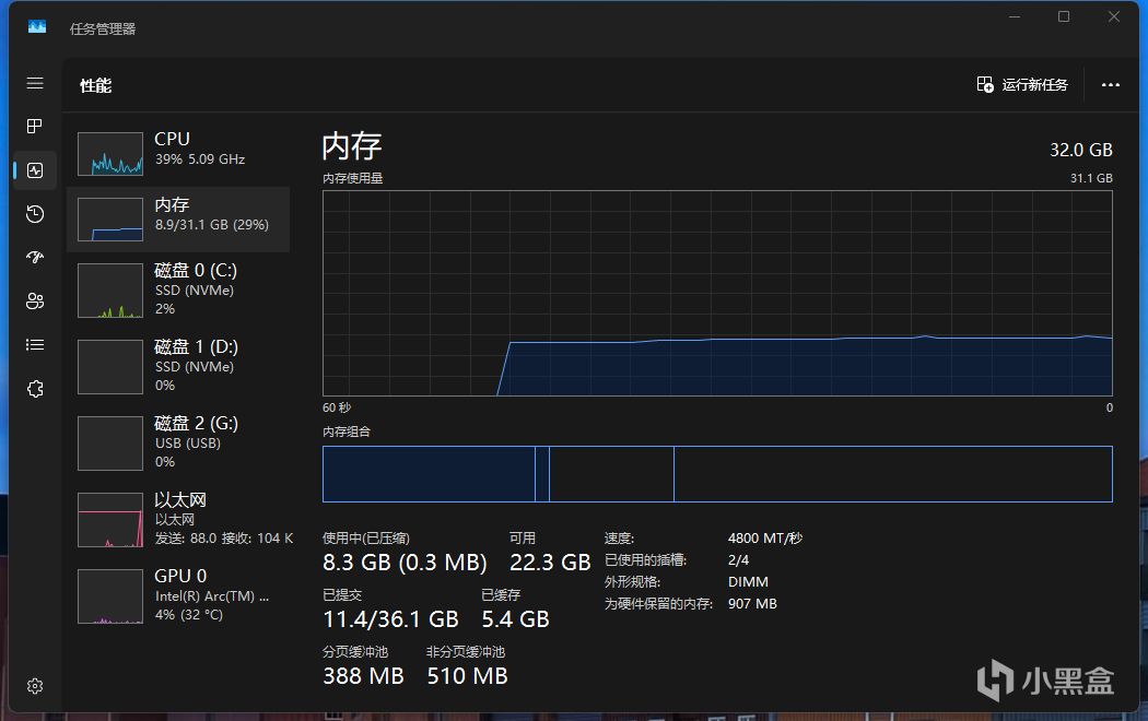 點亮PC後,我們從Windows任務管理器中內存頁中,可以看到,它的默頻爲4800MHz。