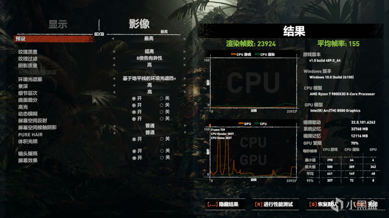 《古墓麗影:暗影》1080P模式最高畫質下,可以達到155幀。