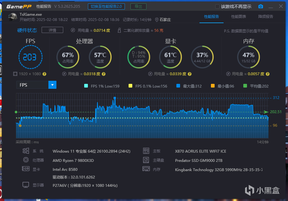 我們也分別對內存頻率變化比較敏感的網絡遊戲進行了測試,其中《PUBG》,在1080P的模式下,它的幀率達到了203,1%的Low幀爲159。