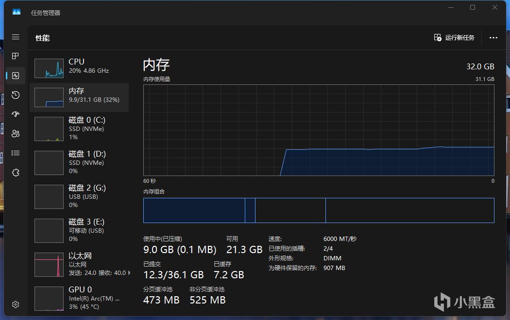 重啓之後再次進入任務管理器的內存頁面,這個時候就可以看到,內存已經穩定在6000MHz的頻率運行了。