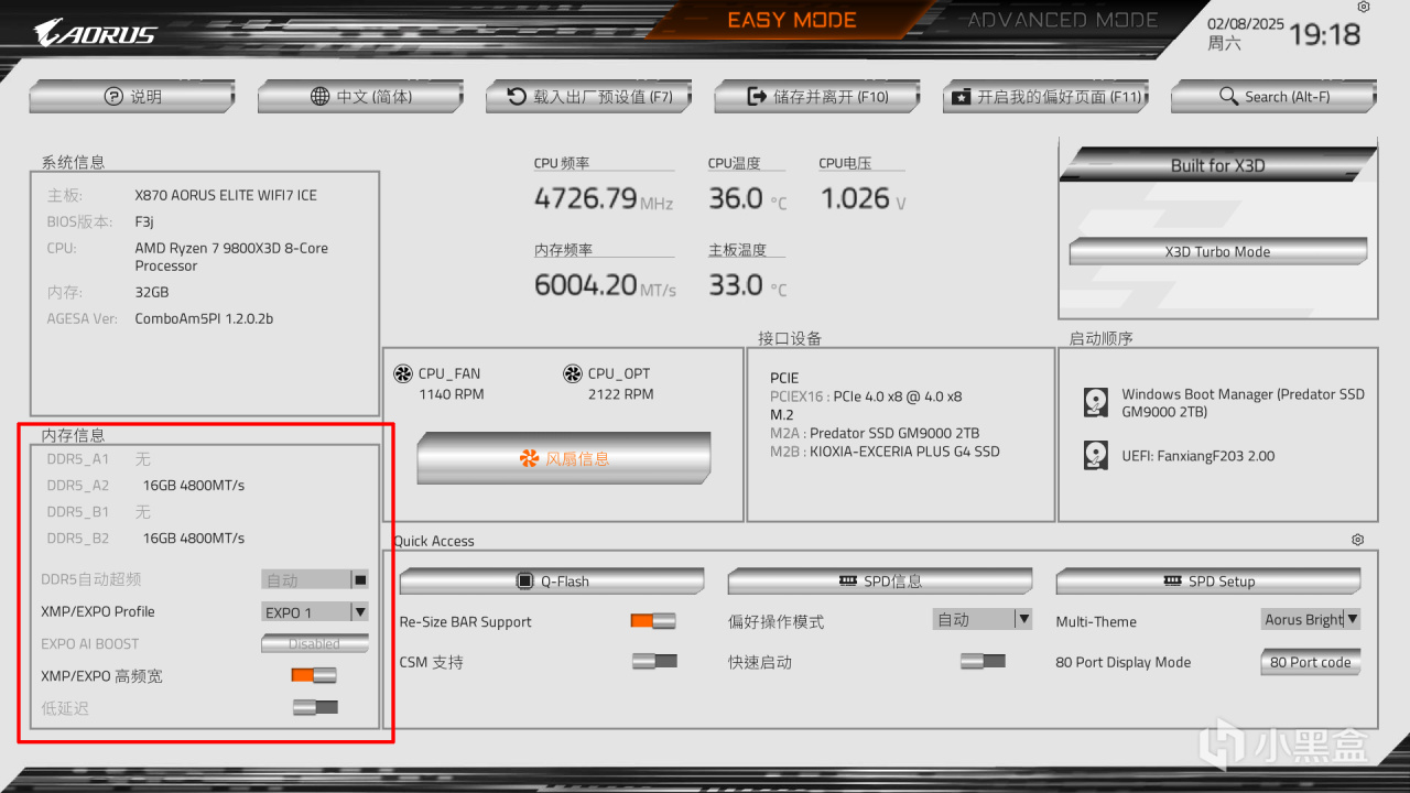啓用EXPO需要進入BIOS進行設置,我們以技嘉X870主板爲例,在進入BIOS之後,我們在左下角的內存區域開啓EXPO1、並打開高頻寬。