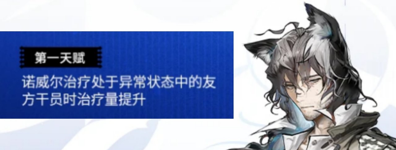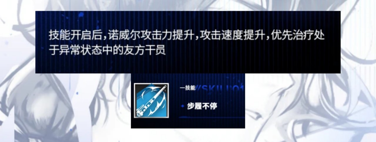 諾威爾①技能加攻擊、攻速,比較像通用技能迅捷打擊的效果,還多了一個優先治療異常幹員的效果,①期間具備治療優先度,更容易觸發天賦提升奶量的效果