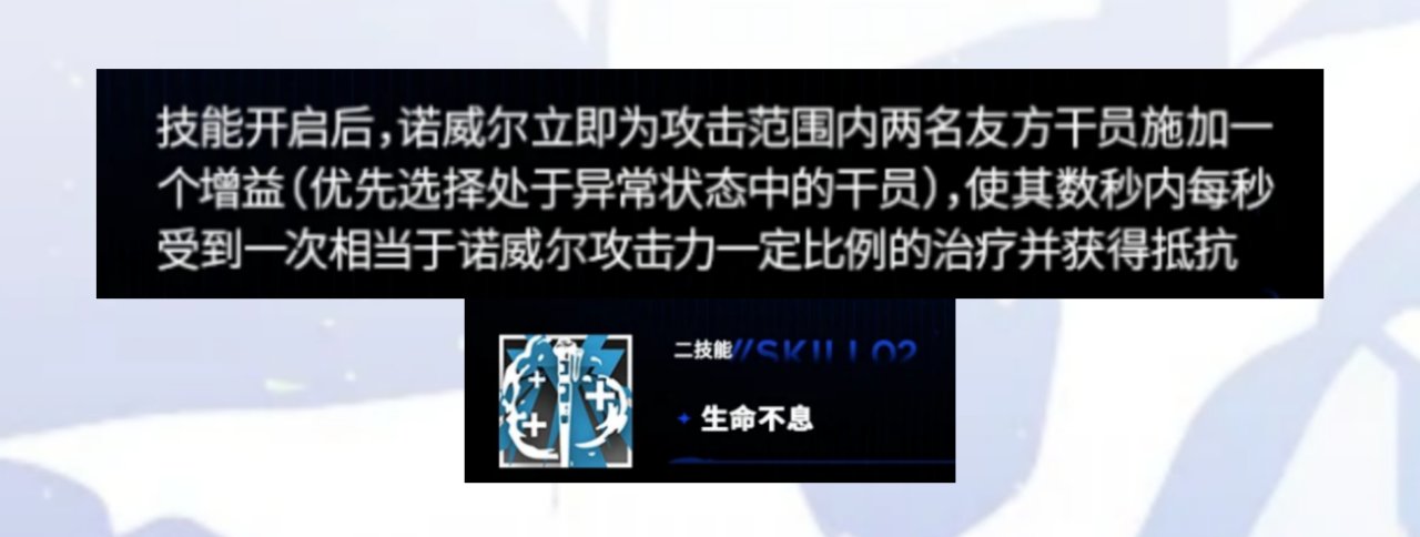 倆技能都有優先治療異常幹員的效果,和天賦聯繫密切,猜測②技能10/20技力安排?賦予兩名幹員10秒抵抗?每秒回血相當於諾威爾攻擊力20%的奶量?配天賦能有每秒140+?