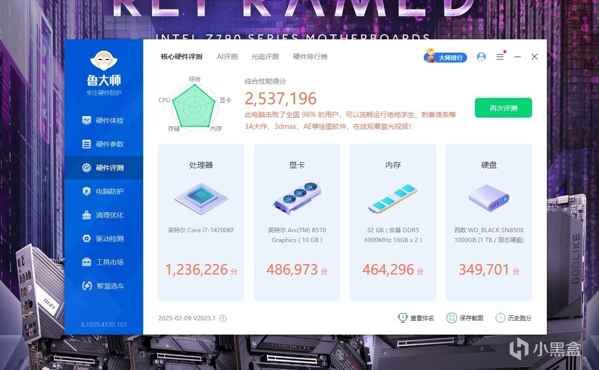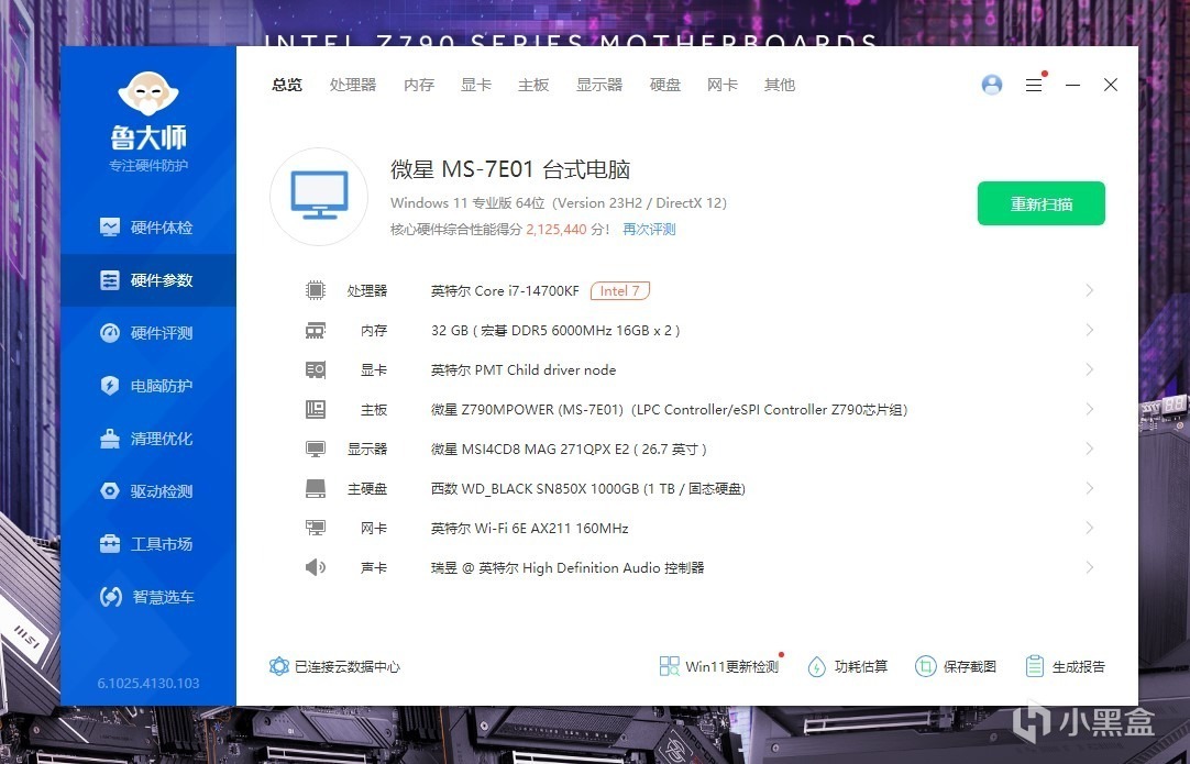 好了,迴歸我們這次的測試,先通過魯大師來看看測試電腦的配置,CPU是英特爾i7-14700KF,內存是宏碁DDR5 6000MHz,顯卡識別爲英特爾MPT Child driver node,看來魯大師還咩有更新。主板是微星Z790MPOWER,顯示器是微星MAG 271QPX,硬盤是西數WD_BLACK 1TB,還有另外一個硬盤。