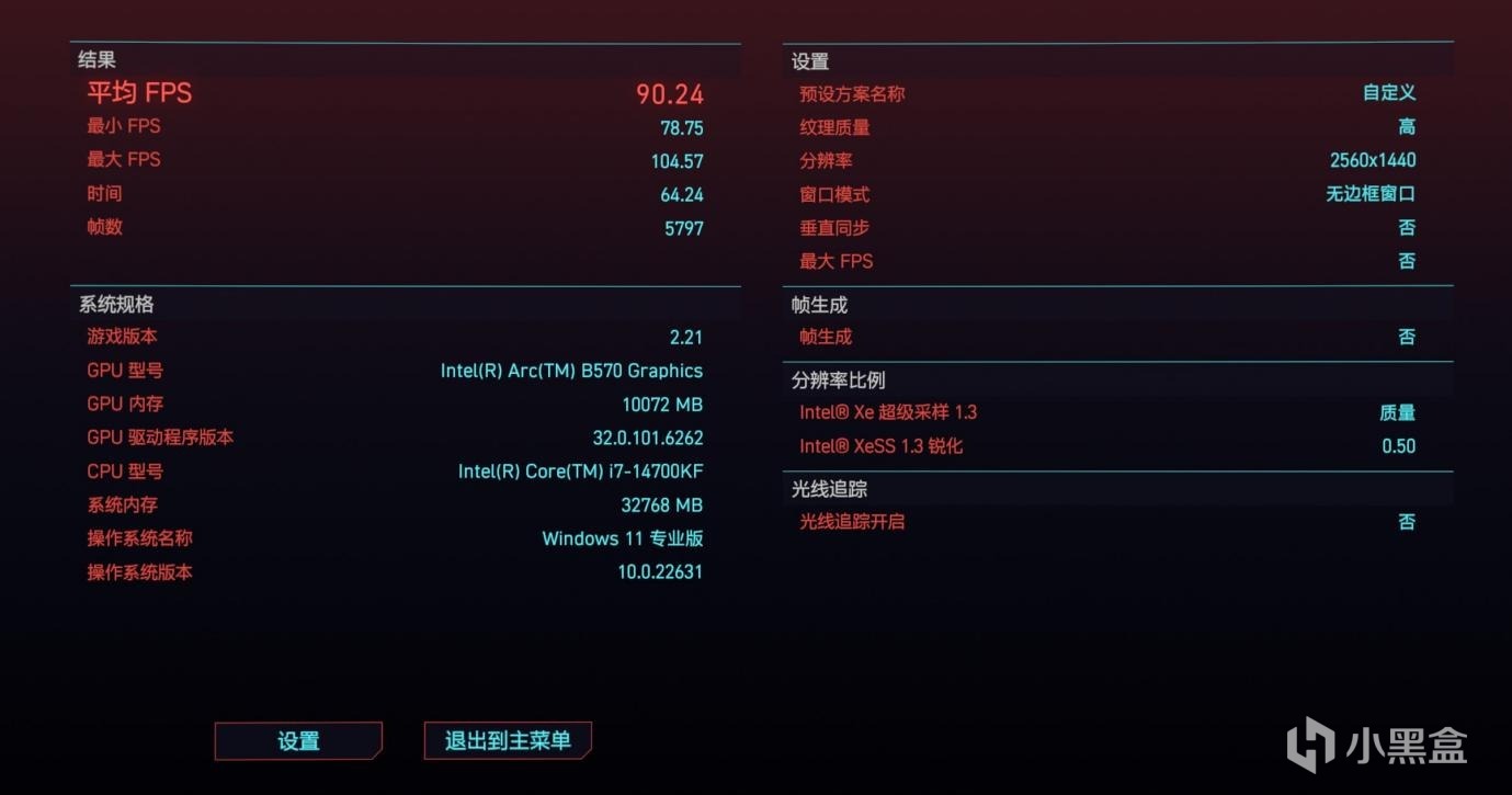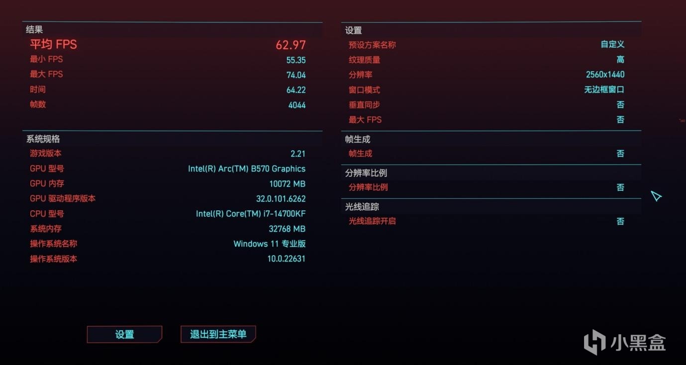 首先是賽博朋克2077,在高畫質下,不開啓XeSS是62.97幀。
