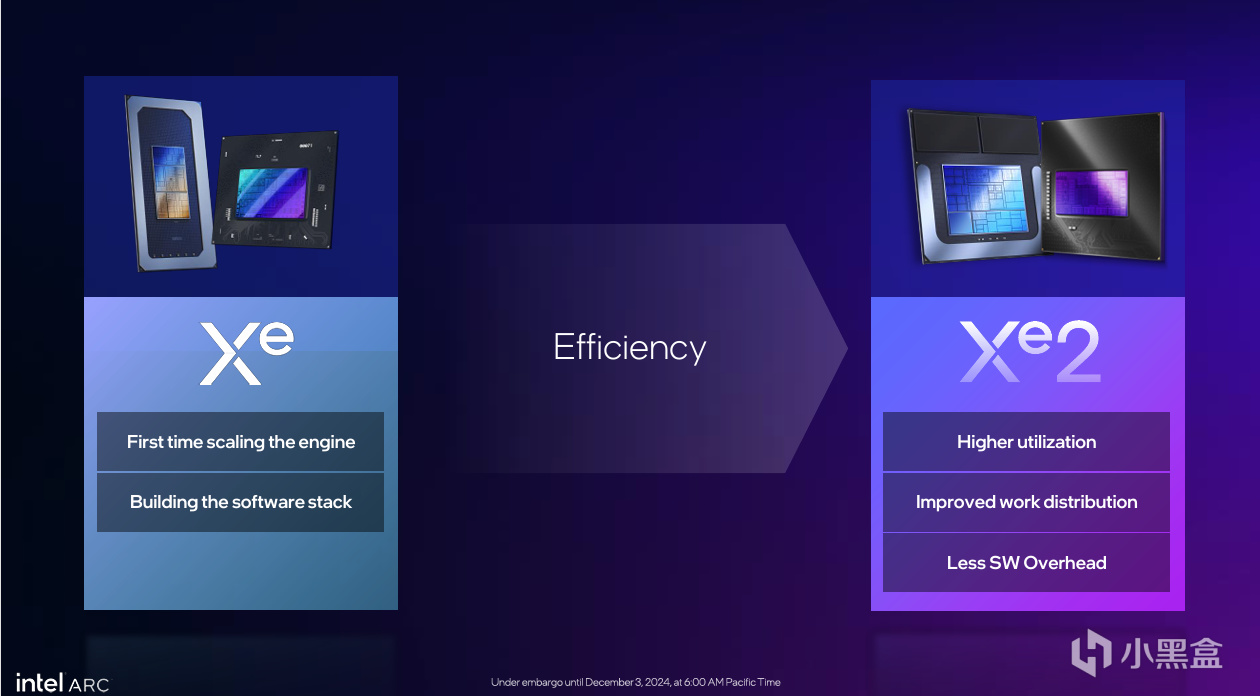 這是因特爾的第二代顯卡,更方面均有增強。從原來的Xe架構升級爲Xe2,一代更比一代強嘛。與上一代Intel銳炫A系列相比,第二代Xe core的核心性能提升70%,每瓦性能提升50%。同時,Xe2的光追性能相比Xe也大大提升。