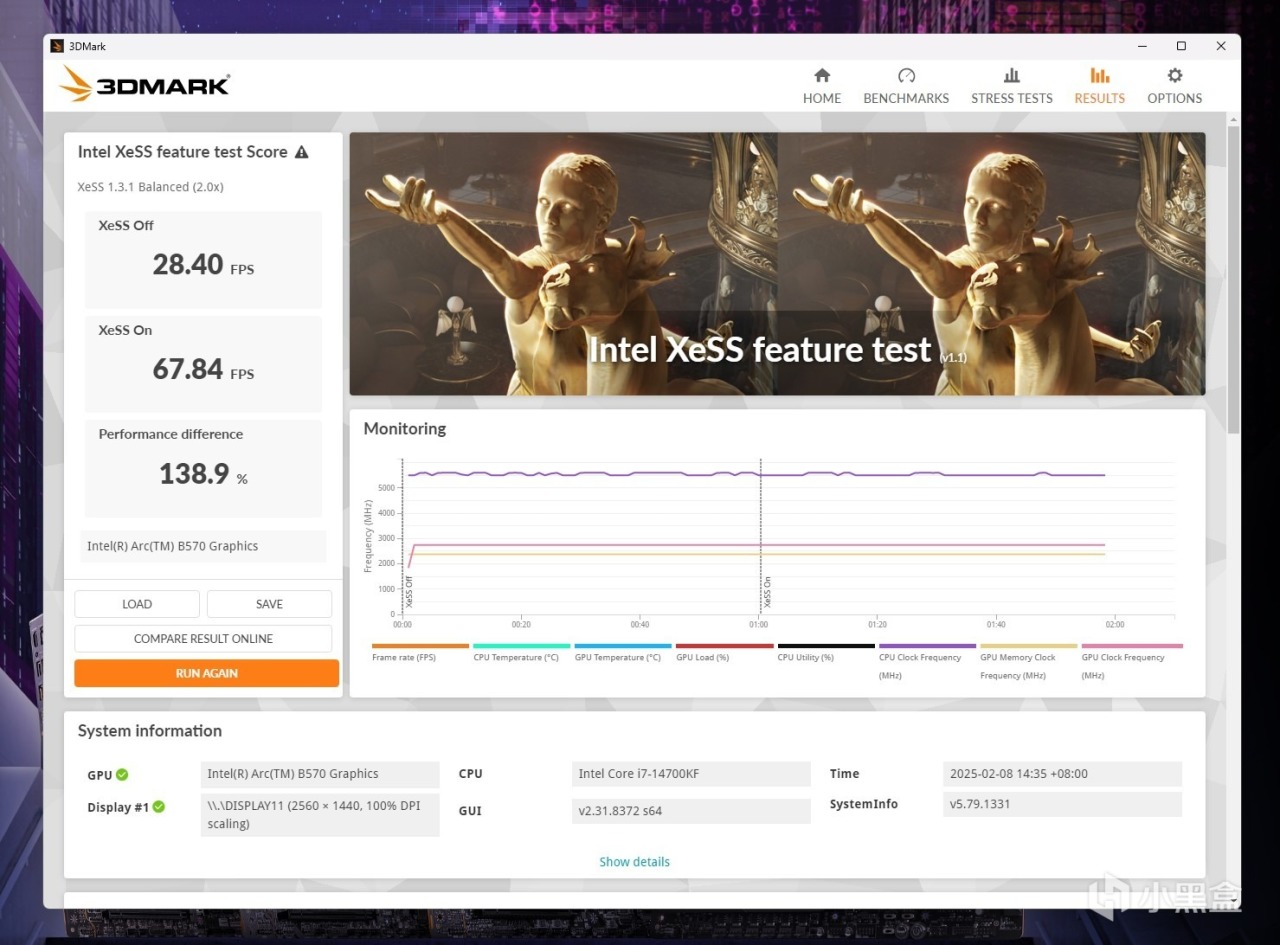 3DMARK XeSS測試,沒有啓用的時候是28.4幀,開啓後可達67.84幀,提升138.9%。