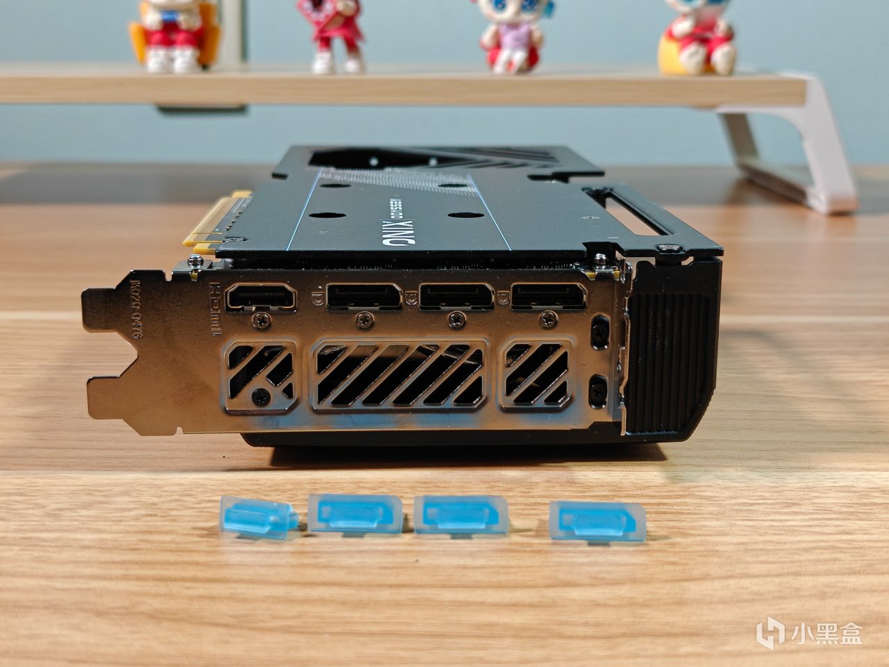 接口部分,配備了3個DP2.1(其中中間那個支持UHBR 13.5)和1個HDMI2.1。擋板有鏤空設計,可以起到散熱作用。